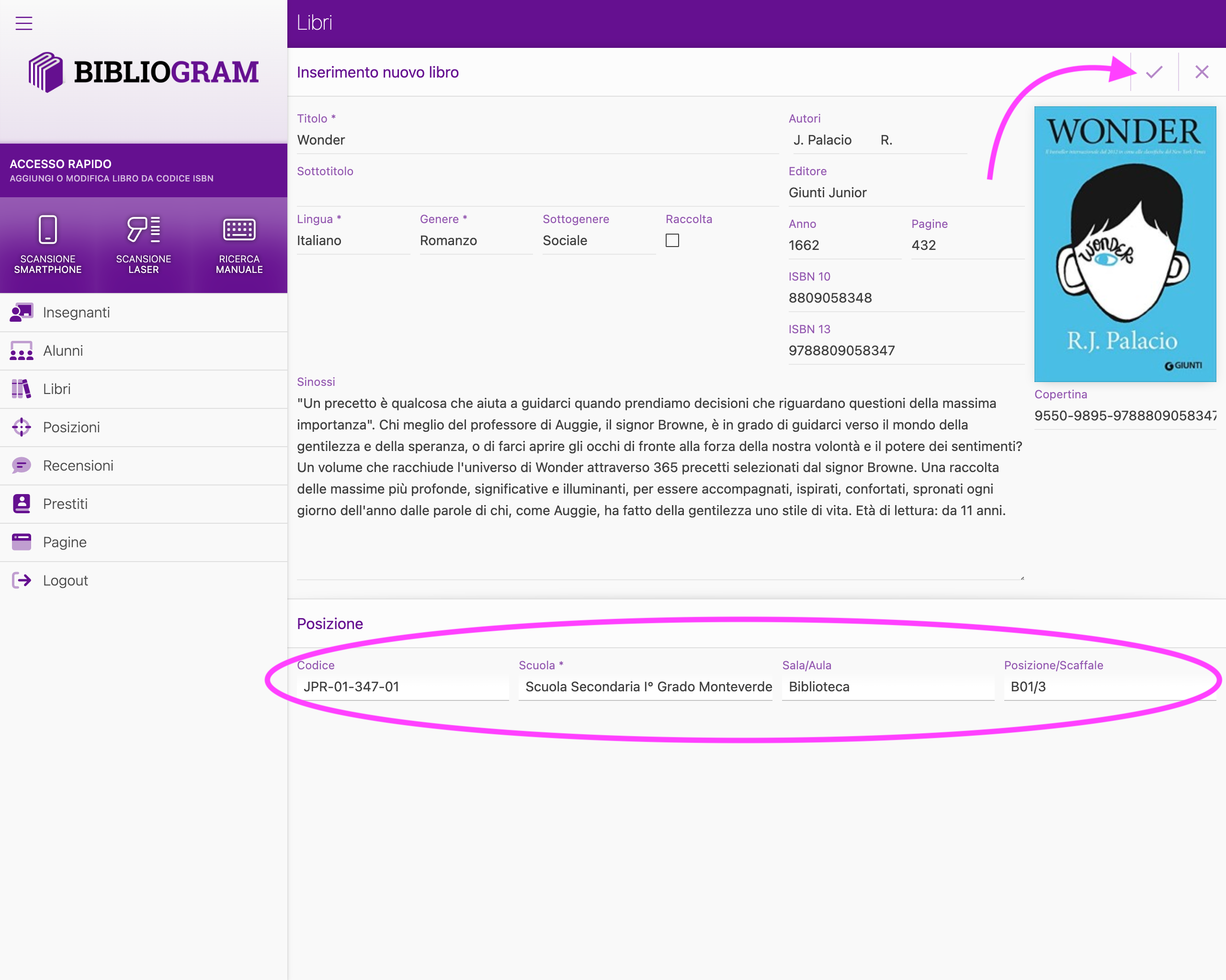 Completata la compilazione della scheda, conferma l’inserimento del libro cliccando sull’icona della spunta posizionata in alto a destra.