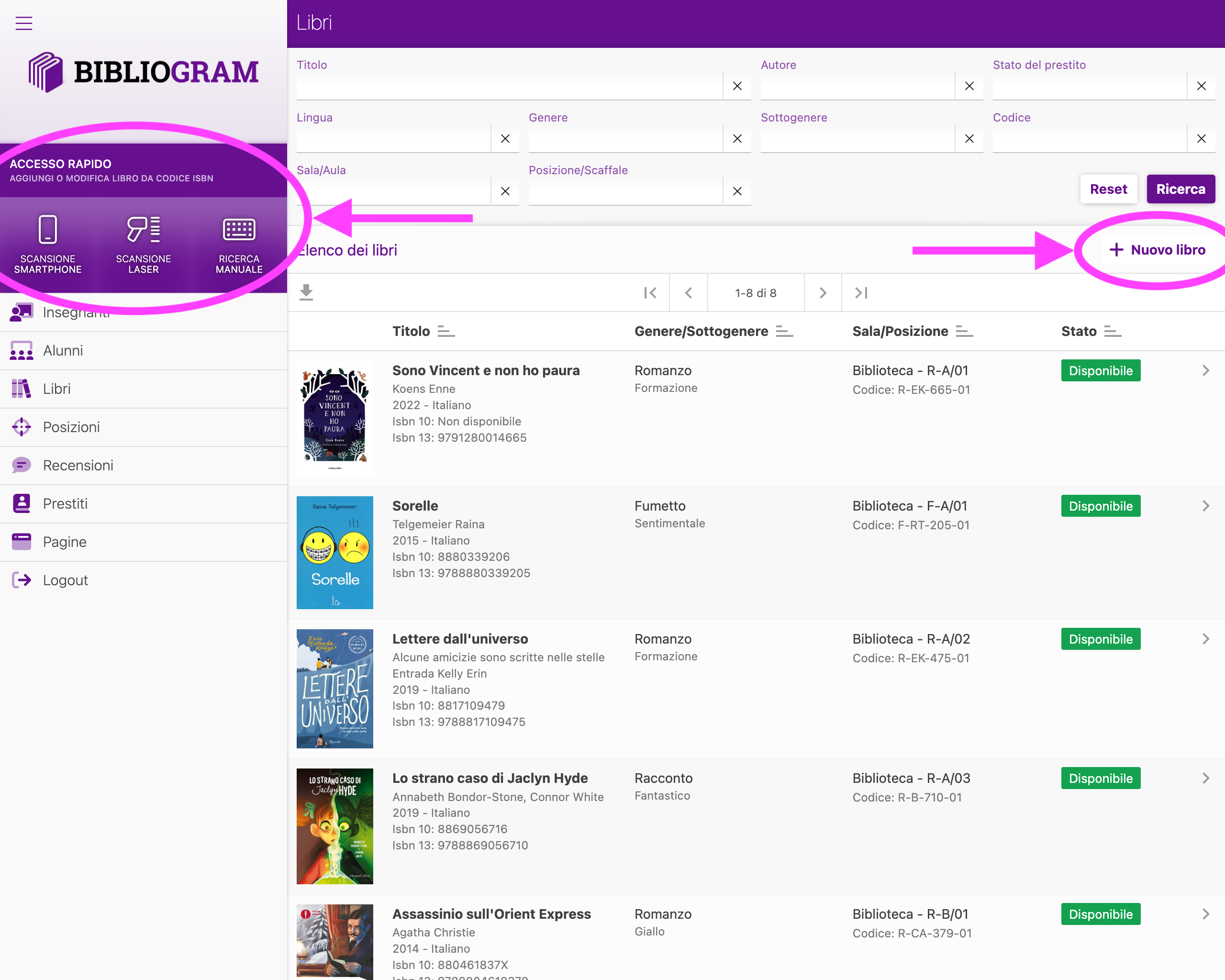 Questi 3 strumenti conducono ad una ricerca del codice ISBN all’interno del catalogo libri della tua biblioteca scolastica. In base al risultato di questa ricerca, Bibliogram ti propone di aggiungere il nuovo libro (pulsante “Aggiungi nuovo libro” nel caso di primo inserimento) oppure una nuova copia del libro (pulsante “Aggiungi nuova copia” nel caso il libro risulti già in catalogo).