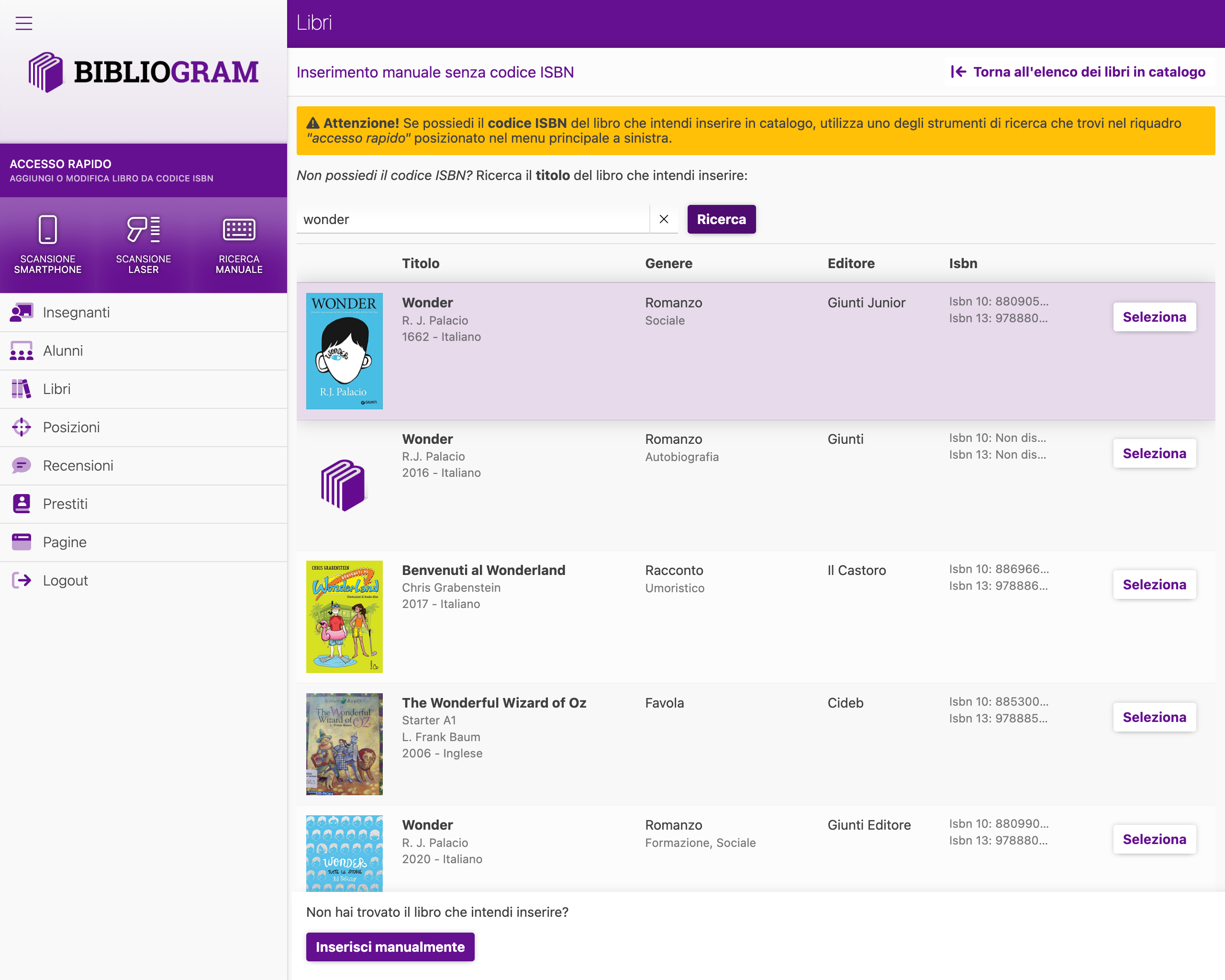 Se non trovi il libro che intendi inserire in catalogo, clicca sul pulsante “Inserisci manualmente” in fondo all’elenco.