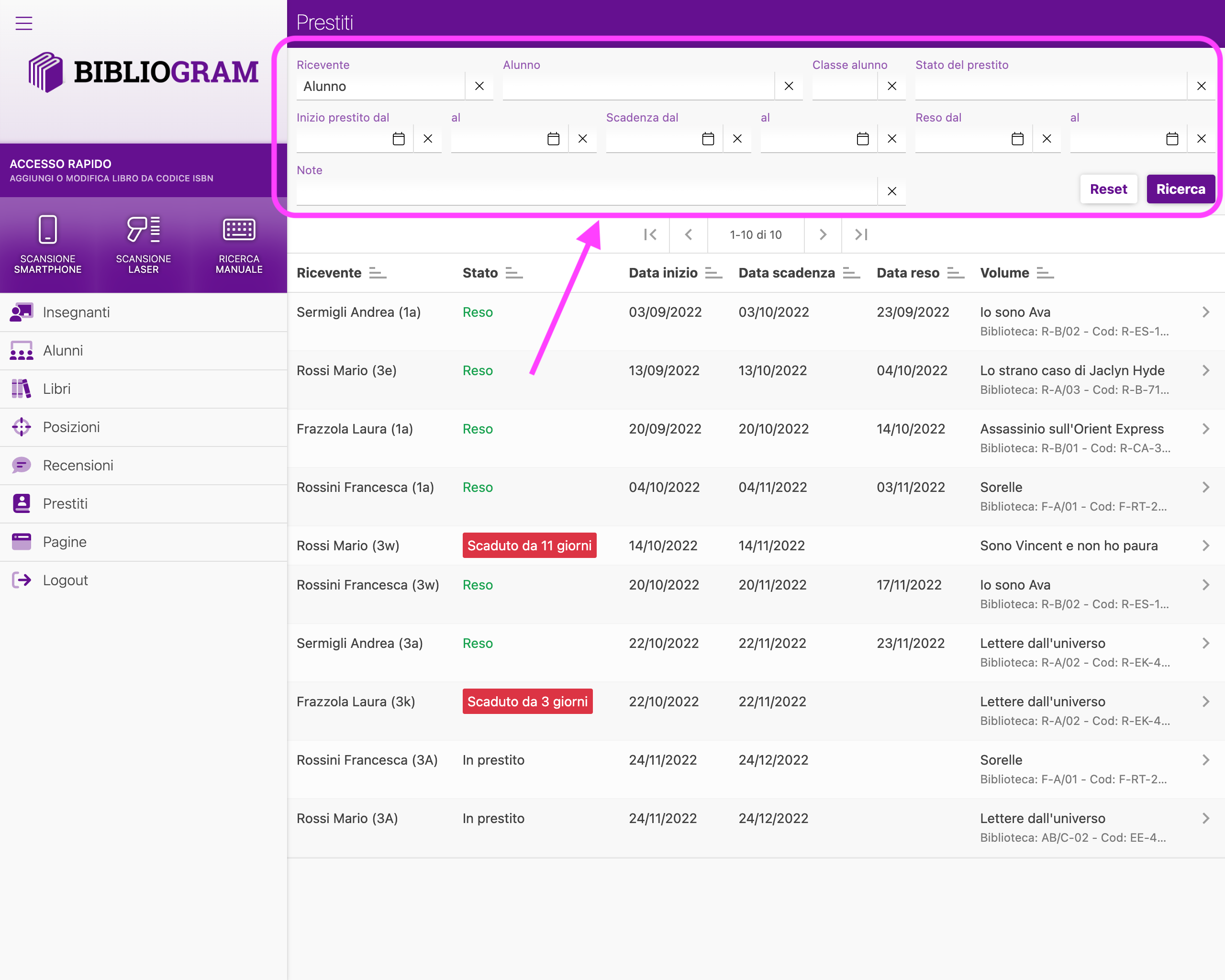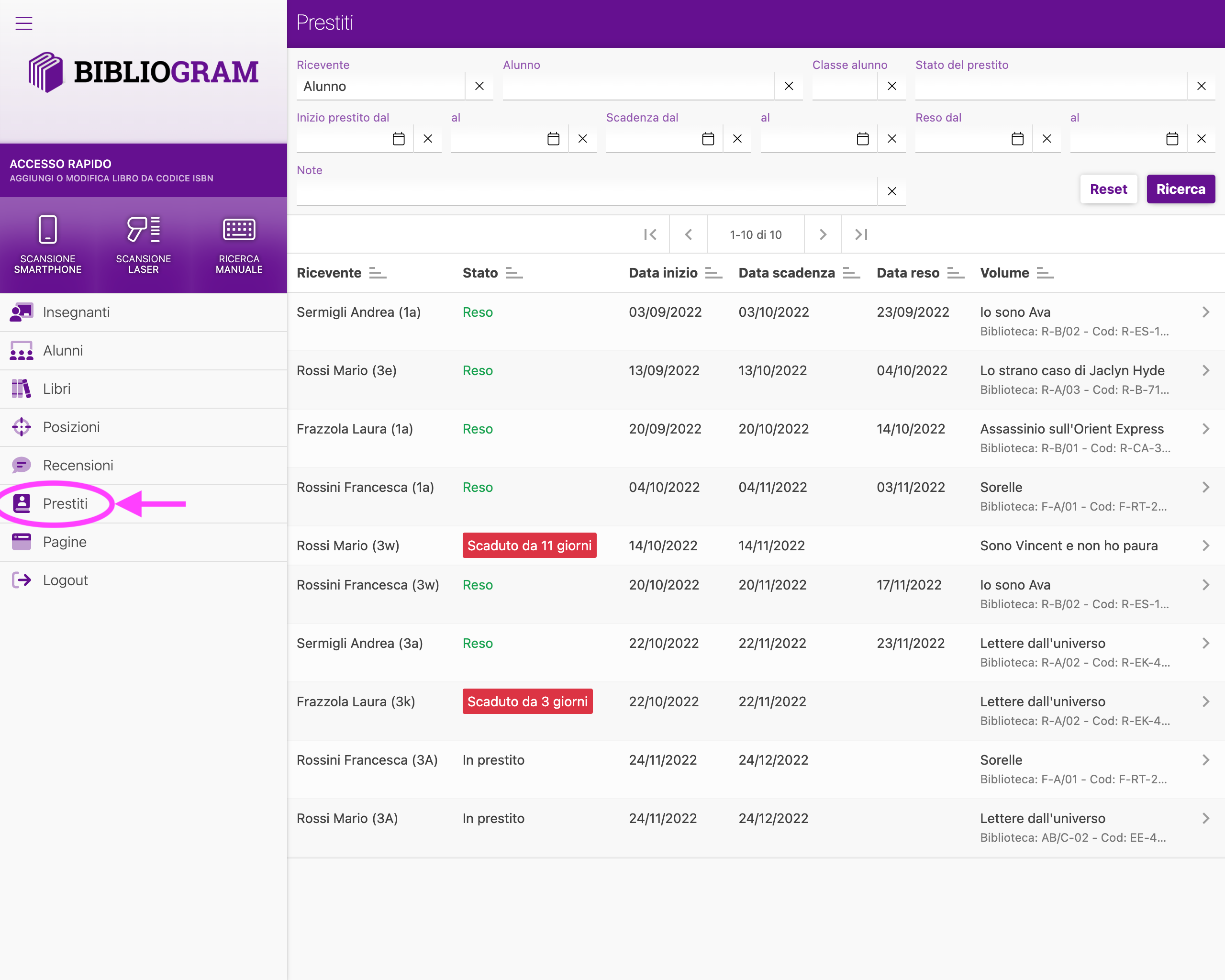 La sezione “Prestiti” è dove puoi gestire l’archivio prestiti della tua biblioteca scolastica: