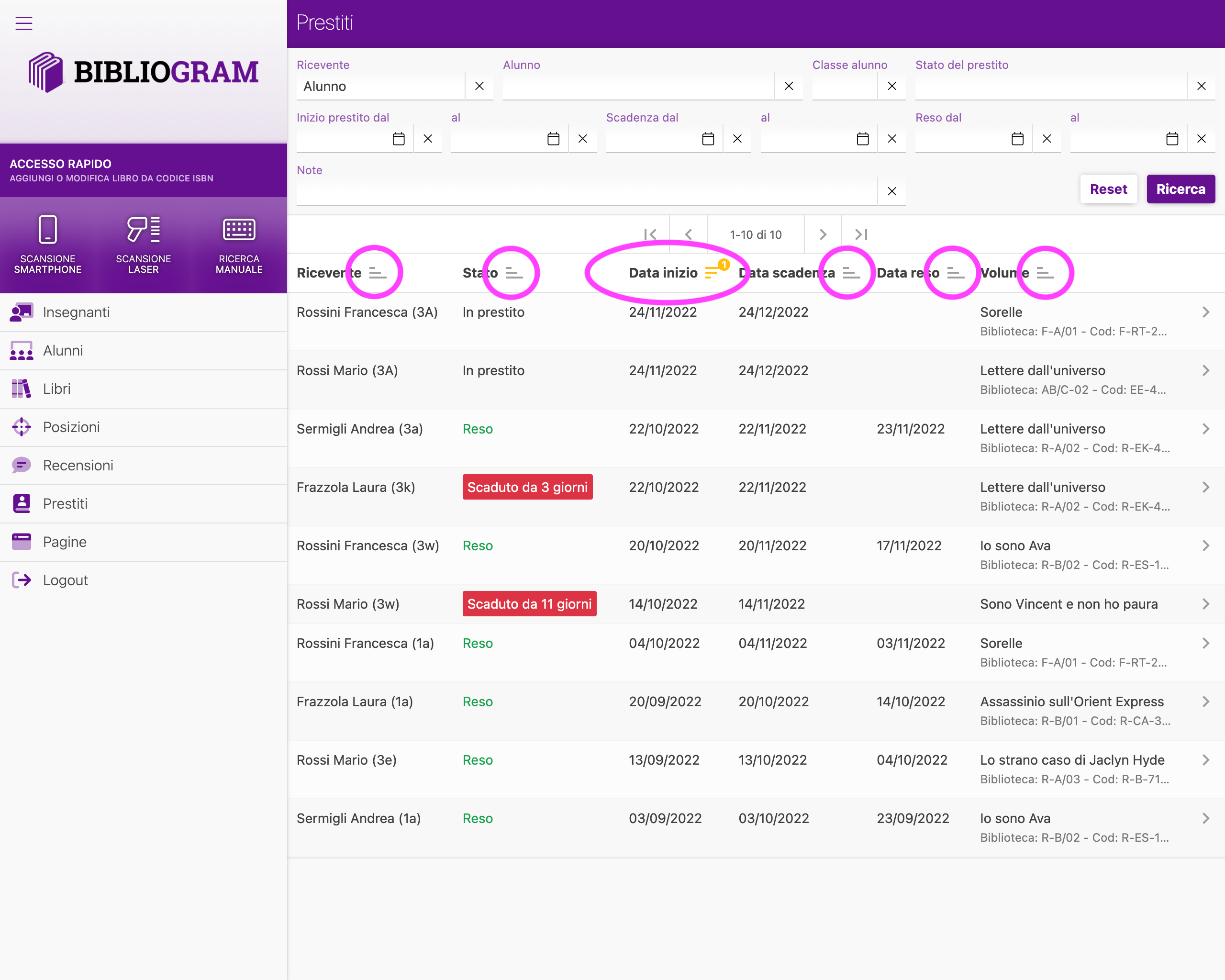L’ordinamento predefinito dell’elenco è per ordine di inserimento (il primo elemento in elenco è il primo registrato, l’ultimo elemento in elenco è l’ultimo registrato). Puoi comunque ordinare l’elenco per ricevente, stato del prestito, data inizio, data scadenza, data reso, volume: clicca una volta sull’icona di ordinamento (relativa al dato che vuoi modificare) per impostare un ordinamento crescente, una seconda volta per impostare un ordinamento decrescente, infine, una terza volta per annullare l’impostazione.