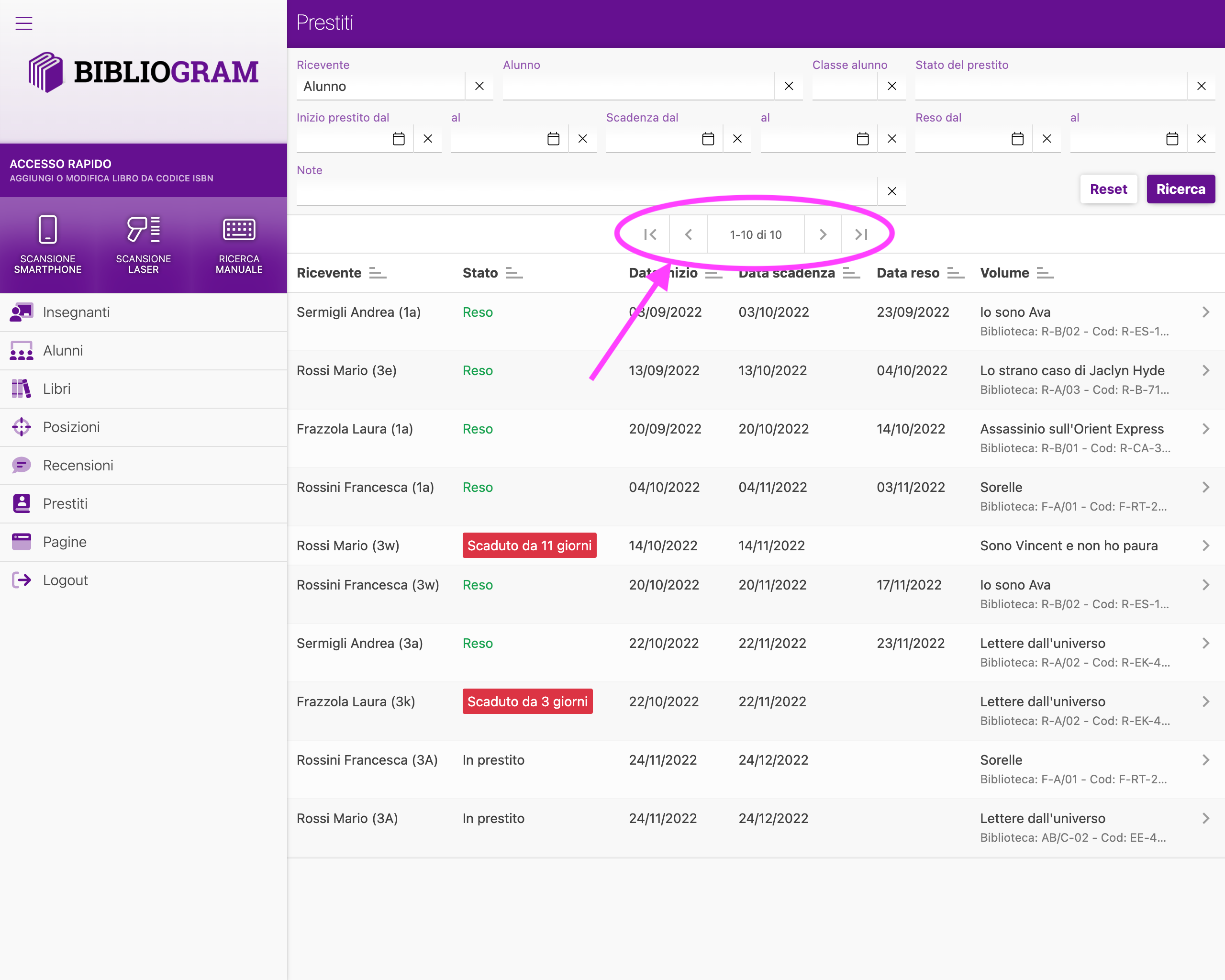In questo elenco puoi visualizzare le informazioni essenziali dei prestiti (attivi, scaduti, resi): nome e cognome del ricevente, stato attuale del prestito, data inizio prestito, data scadenza, data reso, volume.